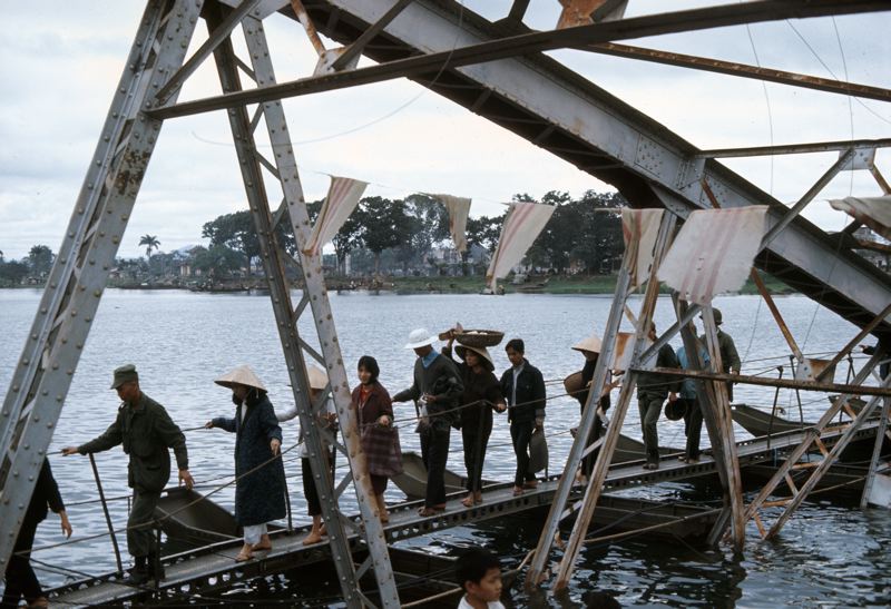 Flyktingar på väg över smal bro, soldater bland flyktingarna .