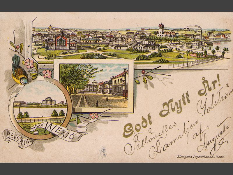 Nyårskort med motiv från Växiö. Text: "Helsning från WEXIÖ. Godt Nytt År / Tillönskas / Familjen Solström / af / August".