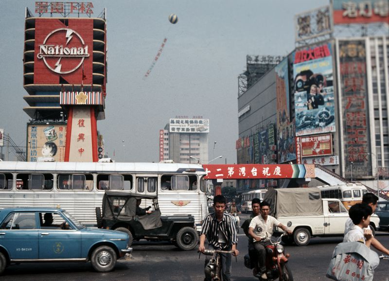 Stadsbebyggelse med reklam- och neonskyltar på byggnaderna. Hårt trafikerad stadsgata. 50-tal.