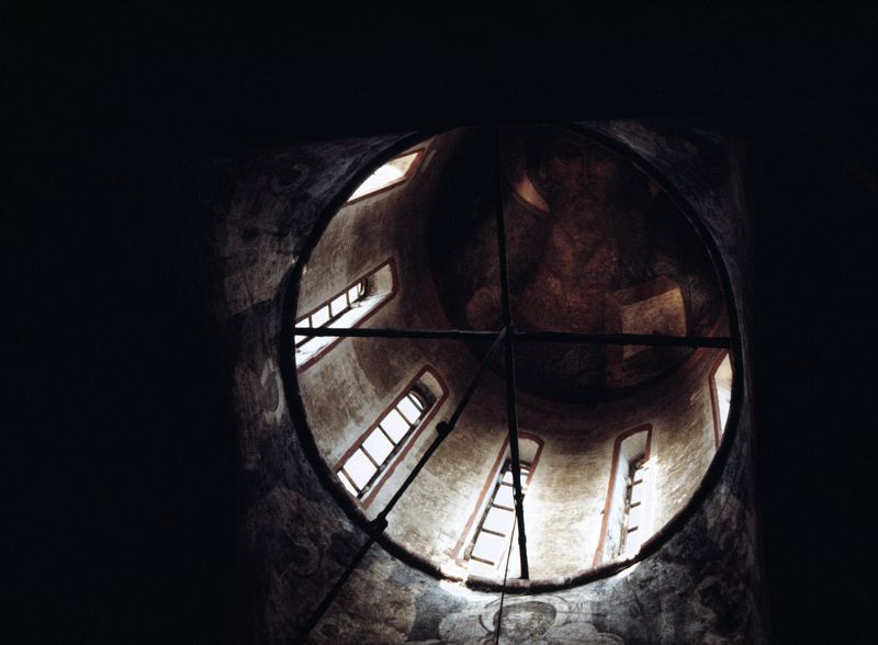 Kyrkokupol med väggmålningar bland annat av kristus.