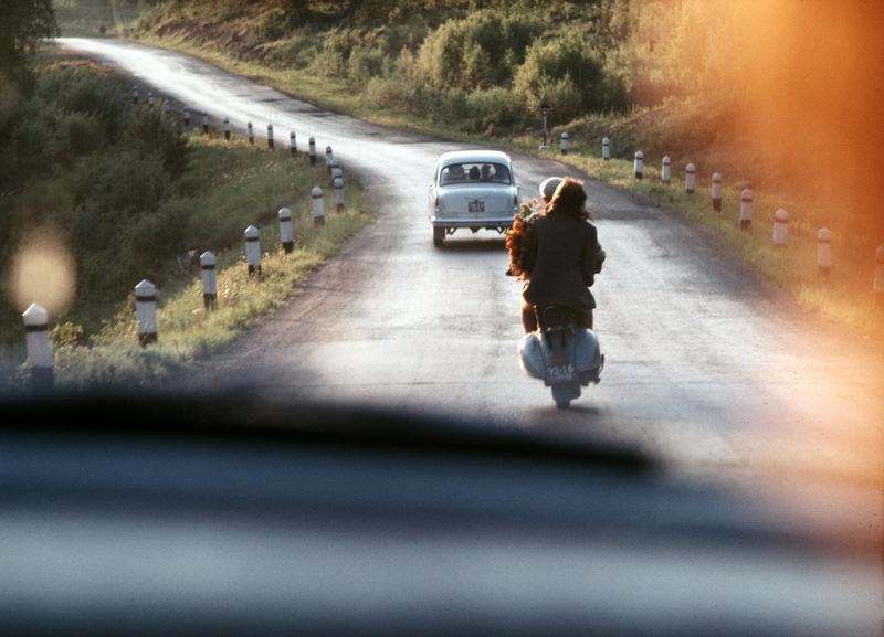 Landsväg genom skogsområde. Bil och mopedist med passagerare bakpå.