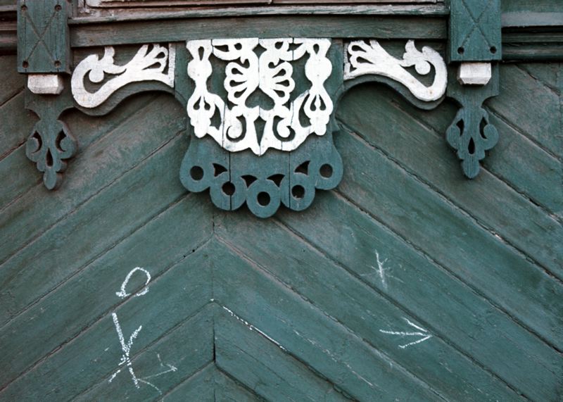 Grön/vit målade lövsågade träsniderier under byggnadens fönster.