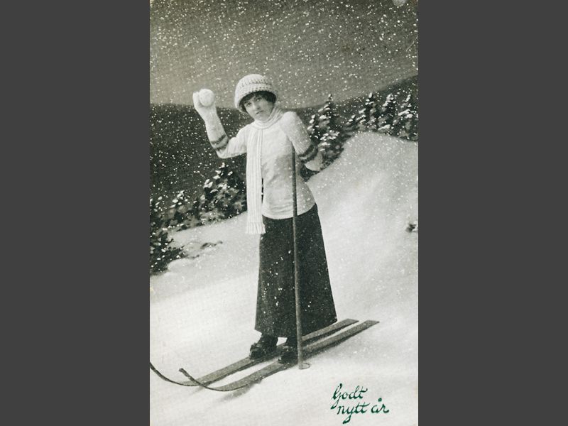 Nyårskort med motiv av en skidåkande ung kvinna (fotografi). Det snöar. Handskriven text: "Godt / nytt år".