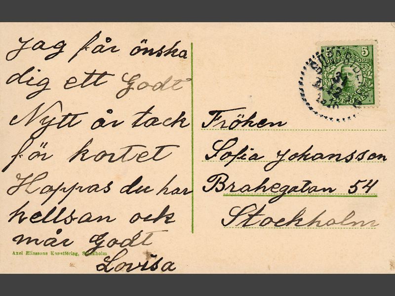 Kortet är adresserat till: "Fröken / Sofia Johansson / Brahegatan 54 / Stockholm". Handskriven hälsning: " Jag får önska / dig ett Godt / Nytt år tack / för kortet / Hoppas du har / hellsan ock / mår godt / Lovisa".