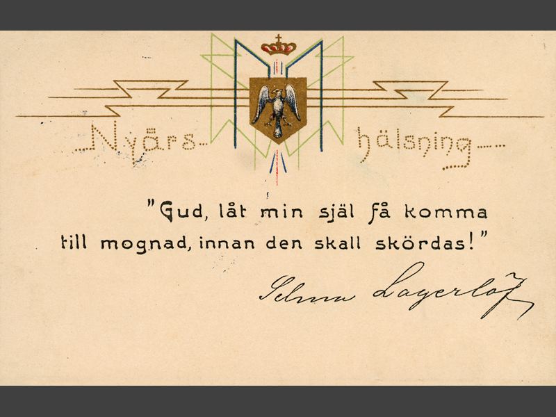 Nårskort med ett emblem med en örn överst. Text: "Gud, låt min själ få komma / till mognad, innan den skall skördas! / Selma Lagerlöf"