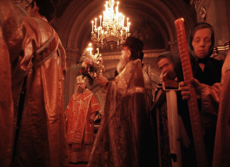 Präster, församling och patriarken Alexij II vid påskfirande i katedral.
