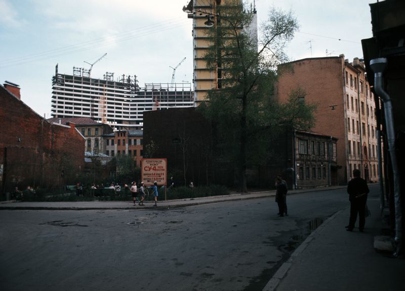Stadsbebyggelse. Gata med äldre bostadshus och nybygge i bakgrunden.