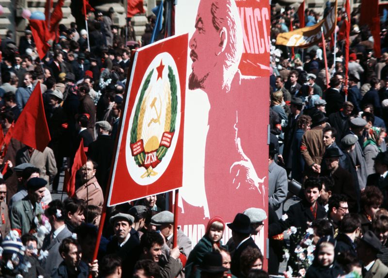 Första maj-firandet. Plakat med bild av Lenin och annat med hammaren och skäran.
