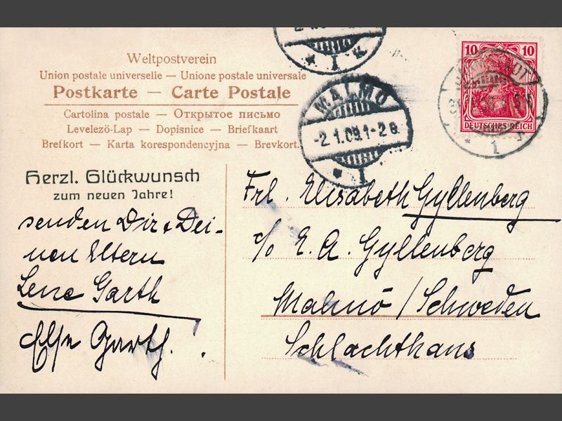 Kortet är adresserat till: "Frl Elisabeth Gyllenberg / c/o E. G. Gyllenberg / Malmö/ Schweden / Schlachthaus". Handskrivet meddelande: "senden Dir und Dei- / nen Eltern / Lene Garth / ????".