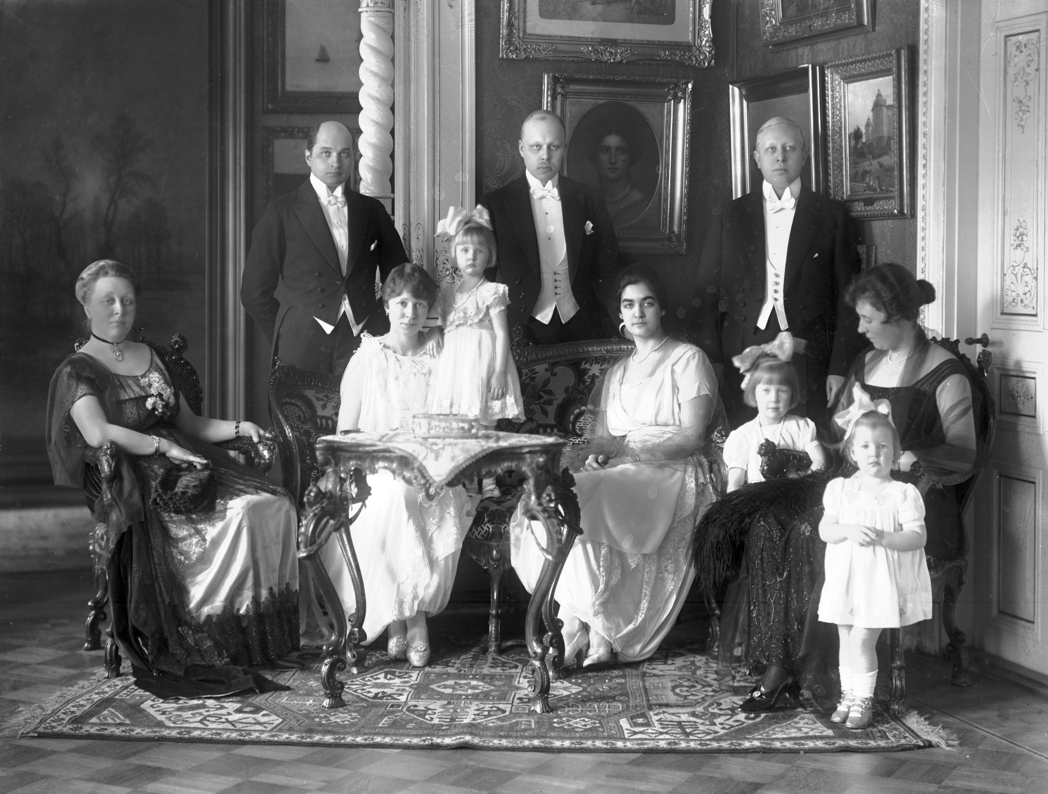 Rumsinteriör gruppbild av familjen Sederholm Bilden är tagen på Villa Saaris i Malmö. Stående från vänster; Friedel Eswein, Folke Sederholm och Bertil Sederholm Sittande från vänster Anna Sederholm, Lisa Eswein född Sederholm, Liselotte Eswein, Margareta Sederholm f Sparre (gift med Folke Sederholm) Marianne Sederholm, Fredrique Sederholm (gift med Bertil Sederholm) och Birgitta Sederholm.