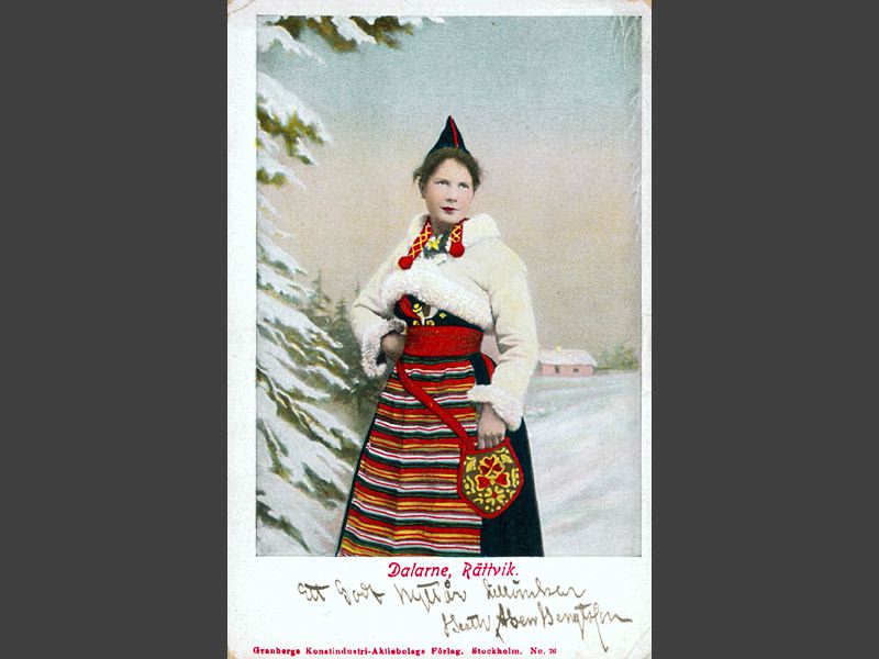 Nyårkort med motiv av en ung kvinna i folkdräkt från Rättvik. Text: "Dalarne, Rättvik / Ett gott nytt år tillönskas / ???? / .