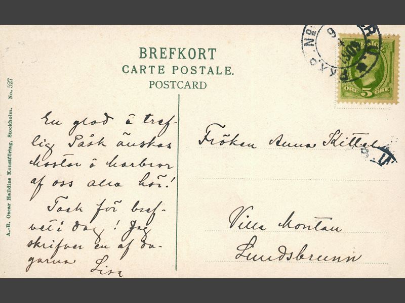 Kortet är adresserat till: "Fröken Anna Kittel / Villa ? / Lundsbrunn". Handskrivet meddelande: "En glad o tref-/ lig Påsk önskas / Moster o morbror / av oss alla här! / Tack för bref- / vet i dag! Jag / skrifver en af da- / garna / Lisa".