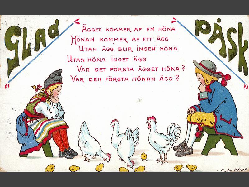 Påskkort med motiv av en pojke och en flicka som sitter på var sin pall. Mellan dem går fyra hönor med sina kycklingar. Text: "Glad / Påsk / Ägget kommer af en höna / Hönan kommer af ett ägg / Utan ägg blir ingen höna / Utan höna inget ägg / Var det första ägget höna? / Var den första hönan ägg?"