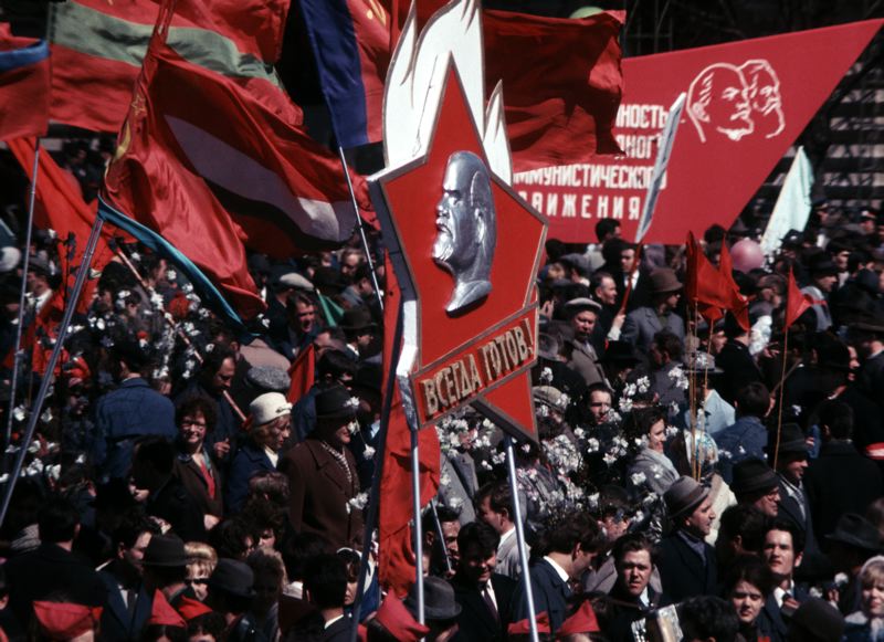 Första maj-firandet. Folkmassa med fanor, flaggor och plakat med porträtt av Lenin, Marx och Engels.