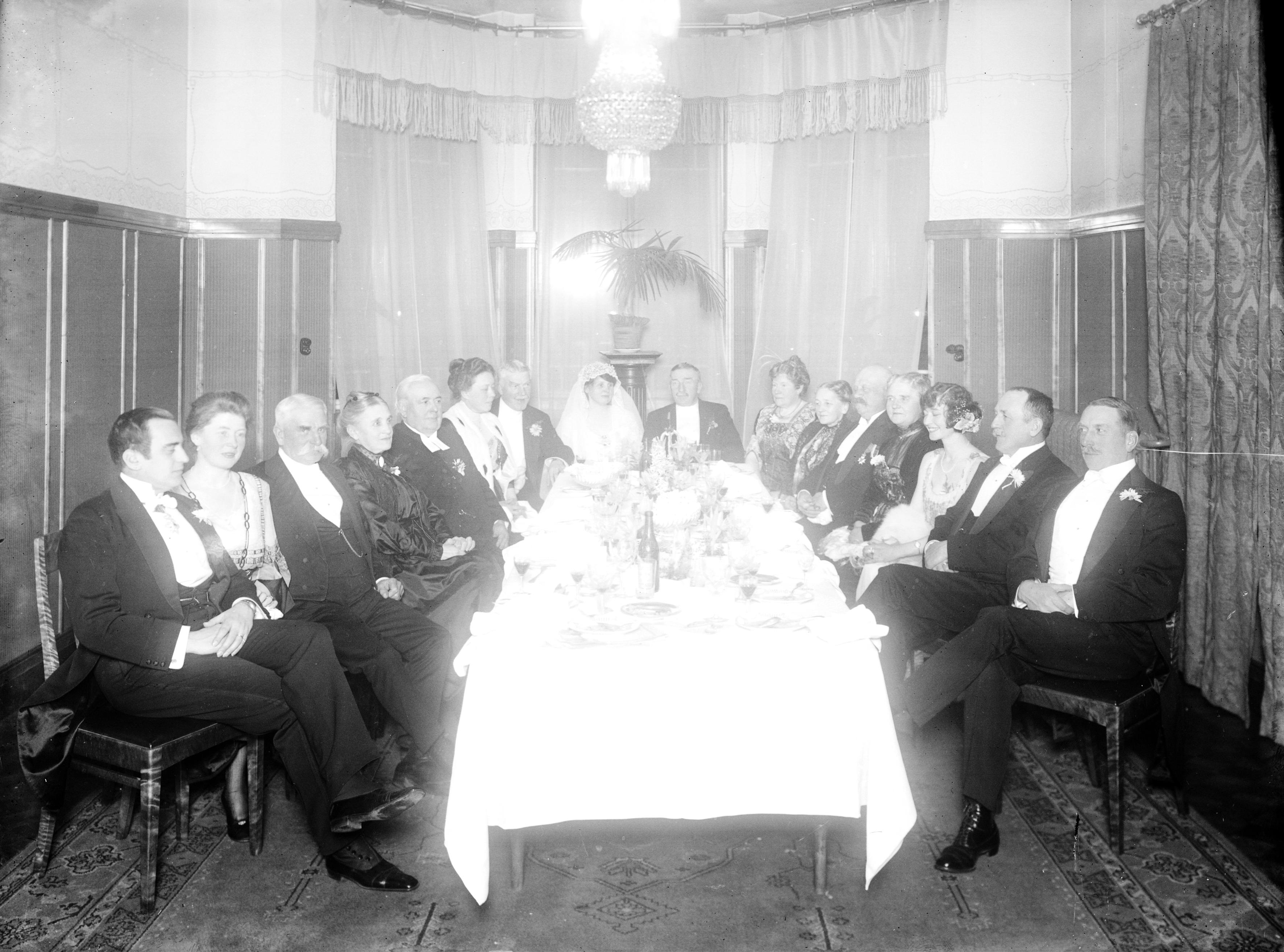 Bröllopsgäster vid dukat bord.