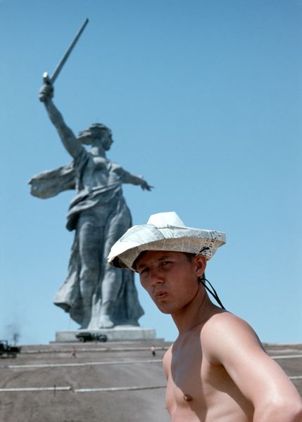 Krigsmonumentet Mamajev Kurgan rest till minne över slaget vid Stalingrad, (Fosterlandet kallar) 87 m hög kvinnostaty på toppen av kullen. I förgrunden man i solhatt av tidningspapper.