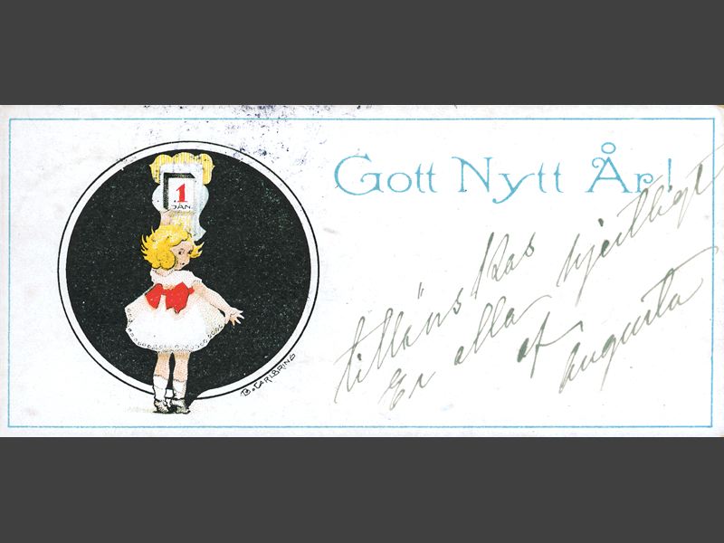 nyårskort med motiv av en liten flicka som står på tå framför en almanacka där det står 1 Jan. Text: "Gott Nytt År! / tillönskas / Er alla hjertligt / af / Augusta".