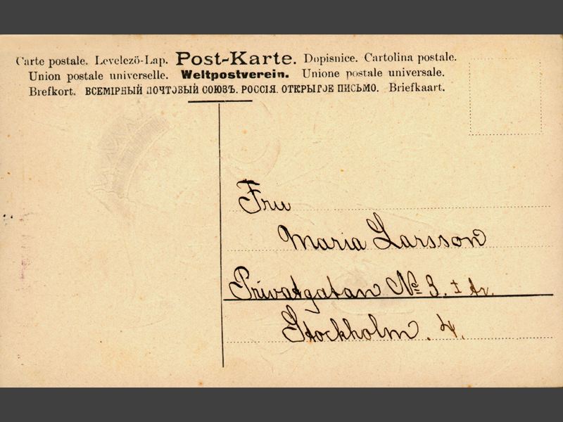 Kortets baksida. Adressen handskriven: "Fru / Maria Larsson / Privatgatan 3, 1 tr. / Stockholm. 4."