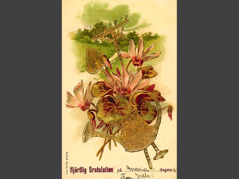 Kortets framsida. Ilustration av en bukett med blommor tillsammans med en vattenkanna och trädgårdsverktyg. Kannan och verktygen i guld och tryckt i relief. I bakgrunden ett landskap. Längst ned en tryckt text "Hjärtlig gratulation på ..... dagen". Det tomma fältet är ifyllt med bläck: "Maria-". Dessutom efter trycket "af / Fru Jette!".