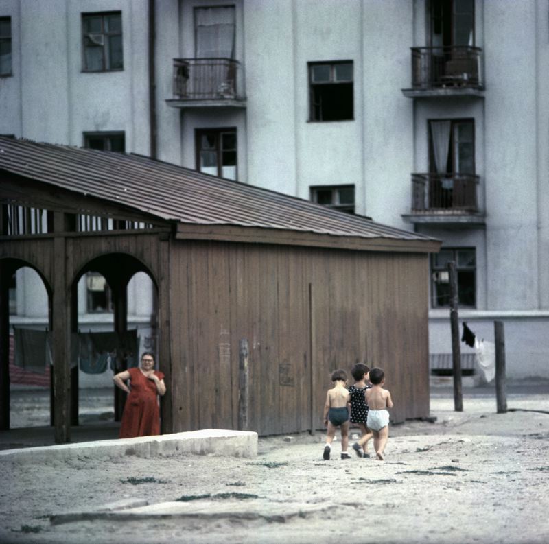 Bostadshus, gård med träbyggnad, hängande tvätt, tre barn och en kvinna.