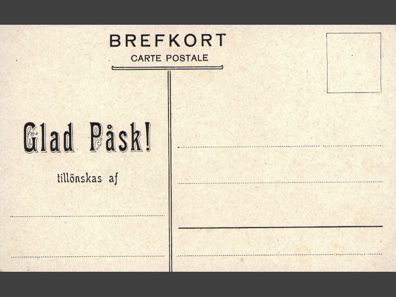 Kortets baksida. "Glad Påsk! / tillönskas af" är tryckt till vänster om adressfältet.