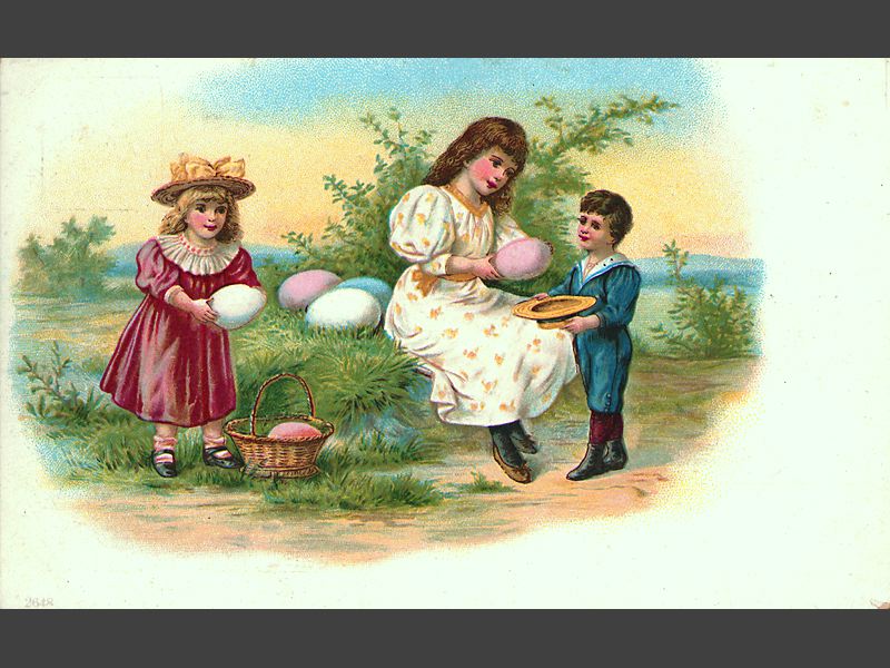 Kortets framsida. Illustration föreställande tre barn - två flickor och en pojke bland buskar och gräs. Flickan till vänster har röd klänning med vit krage och en liten hatt med gul rosett. Hon är i färd med att lägga ett stort vitt ägg i en korg som står på marken. Flickan i mitten har en vit klänning med gula blommor och gul krage. Hon lägger ett stort rosa ägg i pojkens framsträckta hatt. Pojen har en blå byxdräkt med sjömanskrage. Bakom flickan i mitten ligger tre stora ägg.