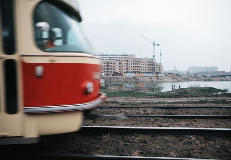 Spårvagnstrafik. I bakgrunden syns ett nybygge.