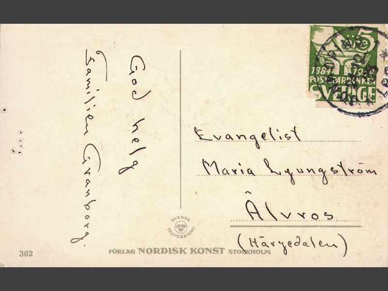 Kortets baksida. "God helg / Familjen Granberg" och "Evangelist / Maria Ljungström / Älvros / (Härjedalen)" skrivet med bläck.