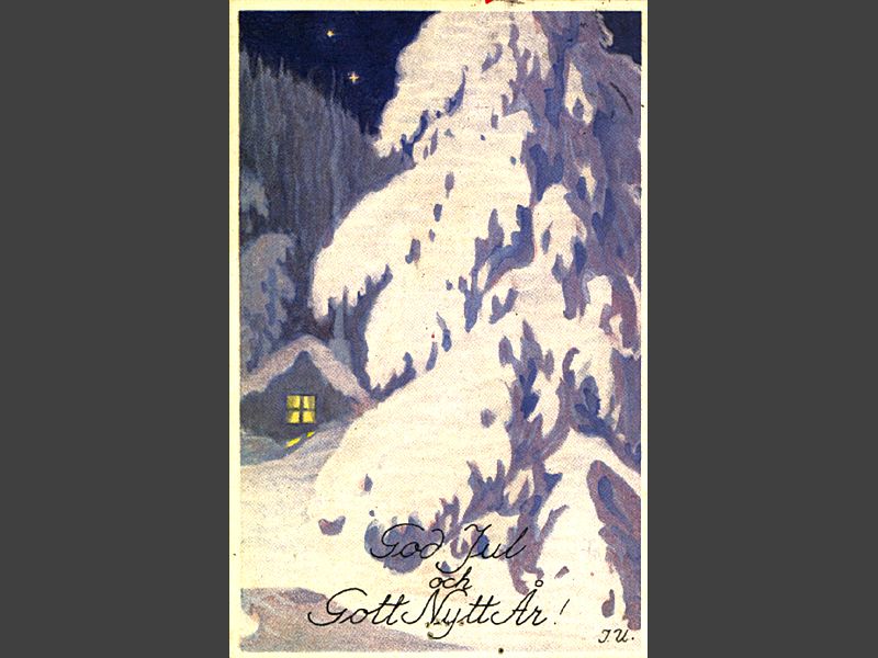 Kortets framsida. Ilustration föreställande snöklätt landskap. I förgrunden täcker en snöklädd gran större delen av bilden. Längre bort syns gaveln på ett hus. Nederst finns texten "God Jul och Gott Nytt År!" tryckt.