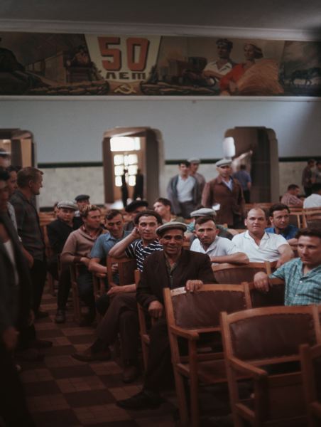 Män samlade och samtalande i möteslokal med politisk affisch på väggen.