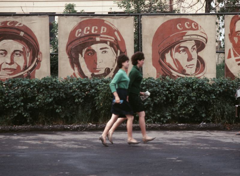 Affischer med tre ryska kosmonauter.