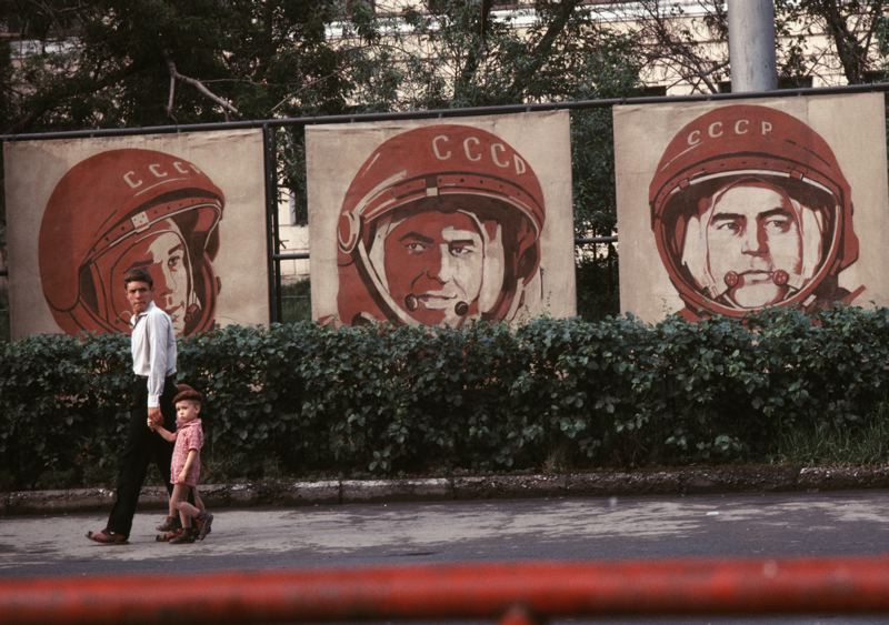 Affischer med tre ryska kosmonauter.