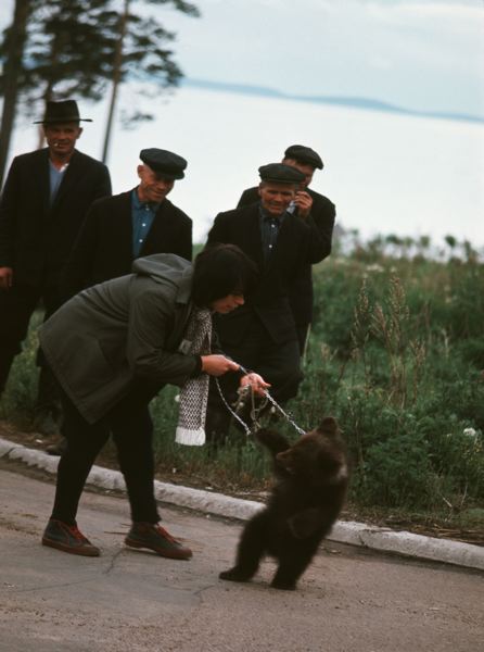 En kvinna med en björnunge i koppel, män står vid sidan av vägen och tittar på.