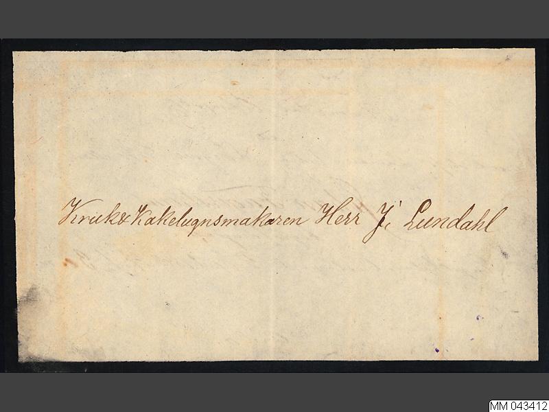 - Notifikatioskort skrivet på vitt papper kantat av svart rand. Kortet är adresserat till: "Kruk & Kakelugnsmakare Herr J. Lundahl. Text på baksidan: "Anmodas Ödmjukt / att / med dess närvaro hedra Färgare Gesällen / Johan Fagerströms / begrafningsakt / Engelholm, Onsdagen d 5 april 1848 kl. 1/2 3 e.m."