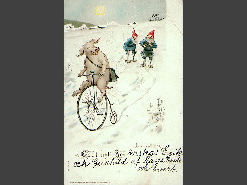 Kortets framsida. Illustration av Jenny Nyström föreställande en gris med postväska på en cykel i ett vintrigt landskap. Grisens cykelfärd bevittnas av två tomtar.