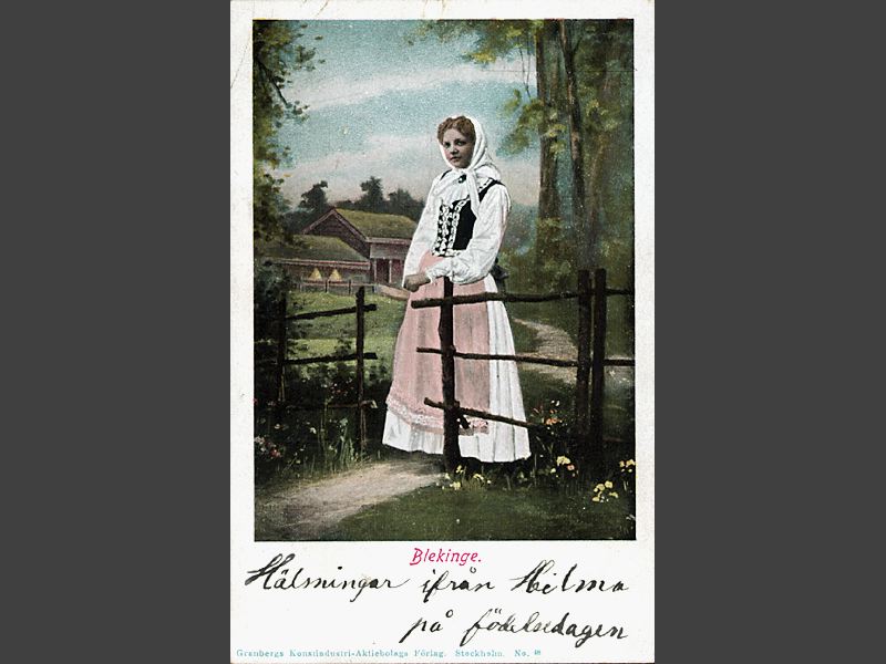 Kortets framsida. Kolorerat fotografi föreställande en kvinna i folkdräkt från Blekinge. Under bilden finns "Blekinge" tryckt i rött och en handskriven hälsning "Hälsningar ifrån Hilma / på födelsedagen".