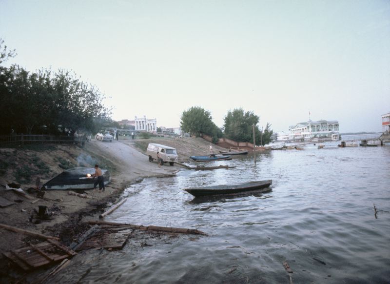 Vy från sjösida mot stranden, två män tjärar en båt, en väg leder från vattenbrynet mot stadsbebyggelse i bakgrunden. Restaurang eller hotell byggt ut på vattnet.