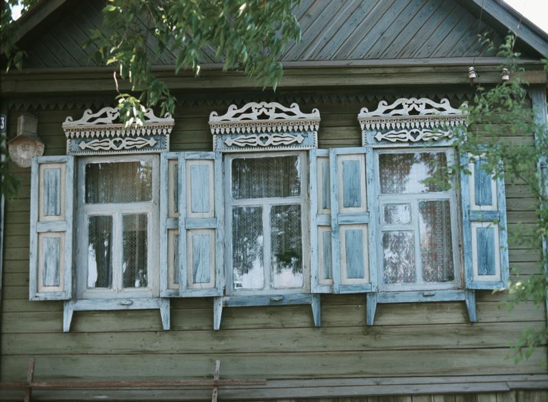 Del av träbyggnad med fönster utskuret trä och fönsterluckor.