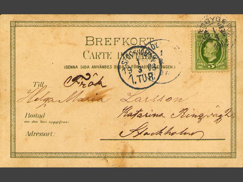 Kortet är adresserat till: "Frök / Helga Maria Larsson / Katarina Ringväg 2 / Stockholm".