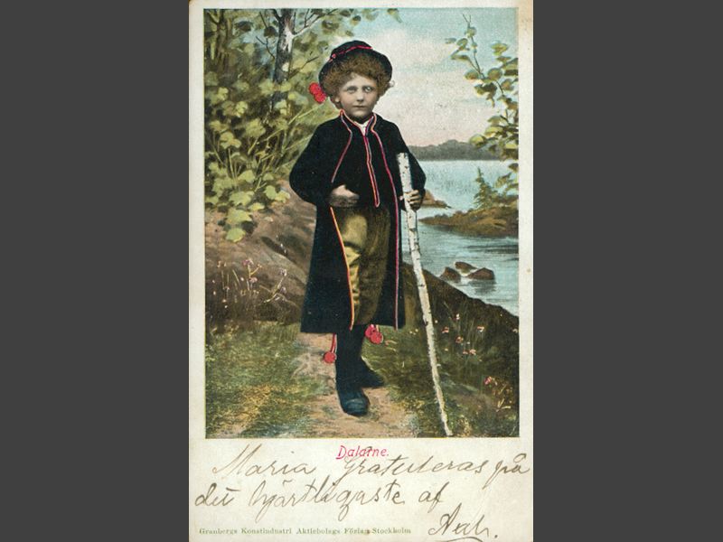 Gratulationskort med motiv av en pojke kädd i hembygdsdräkt. Han har en björkstav i handen och står på en stid invid en sjö. Text: "Dalarne". Handskrivet meddelande: "Maria gratuleras på / det hjärtligaste af / Axel".