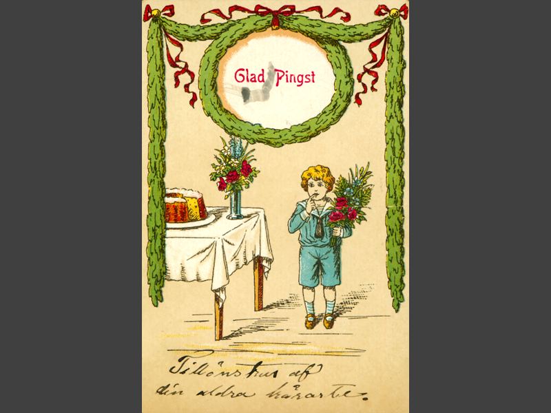 Pingstkort medtiv av en liten pojke i sjömanskläder ståendes med en bukett med blommor i handen bredvid ett bord som är dukat med en tårta och blommor. En grön girlang längs ena kortsidan och delar av de två långsidorna. Text: "Glad Pingst / Tillsönskas af / din aldra käraste".