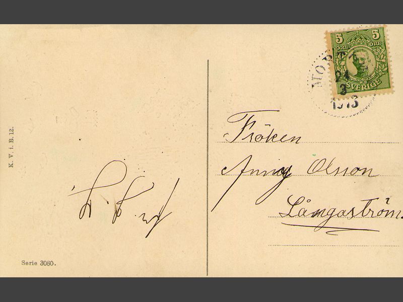 Kortet är adresserat till: "Fröken / Anny Olsson / Långaström". Oläslig signatur på vänster sida.