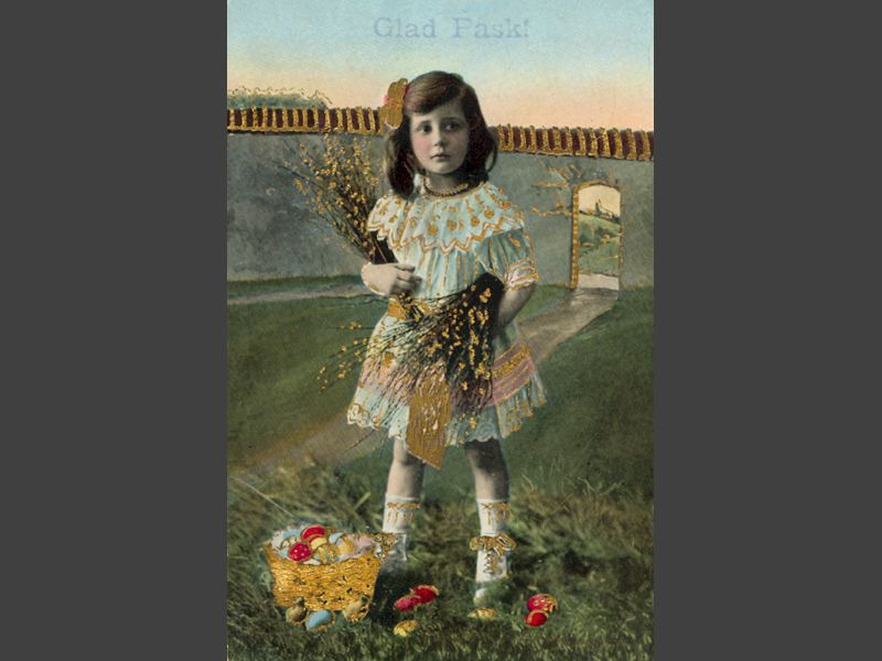 Påskkort med motiv av en flicka klädd i klänning. I famnen håller hon två knippen med björkris och vid hennes fötter står en korg med ägg. I bakgrunden en mur. Text: "Glad Påsk!"