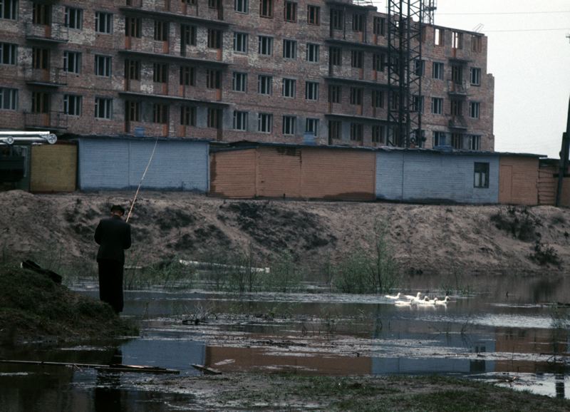 Bygge med baracker framför, i förgrunden en man som fiskar.