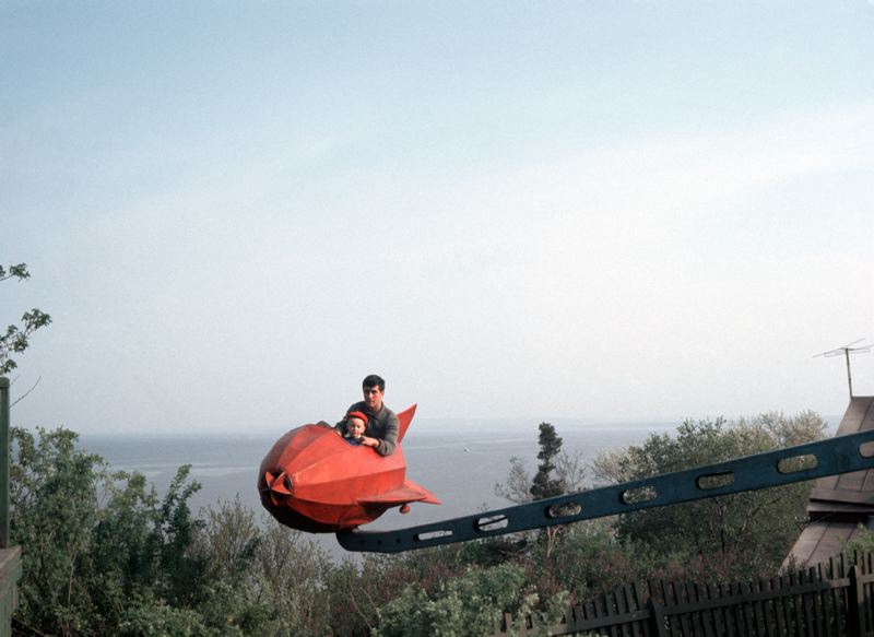 Man och barn sittande i en karusellvagn i form av ett flygplan.