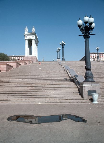 Bild tagen nerifrån en trappa med gatlyktor placerade på en avskiljning i trappan, männinskor står ovanför trappan med byggnader på båda sidorna.
