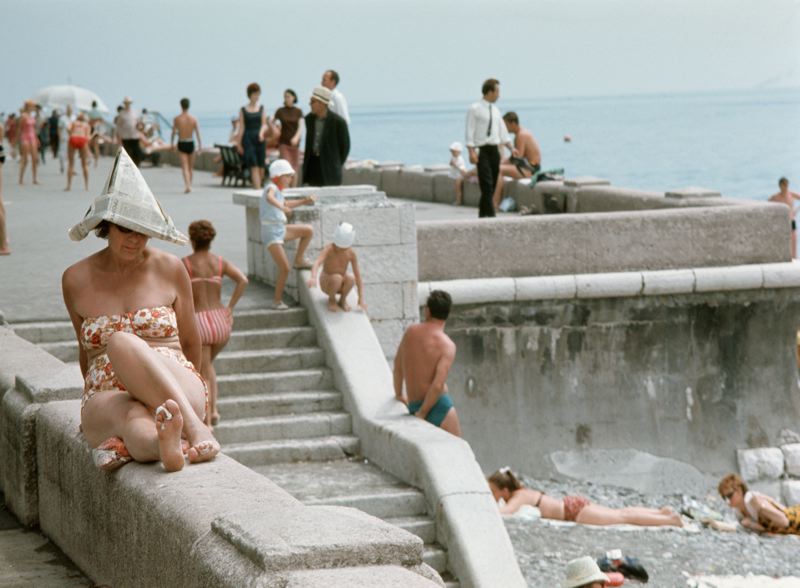 Strandområde med mur och trappa ner till stenstrand. Kvinna med solhatt tillverkad av tidningspapper.