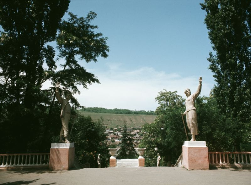 Utsikt från toppen av en trappa flankerad av två statyer ner mot en by med skogsdunge i bakgrunden.