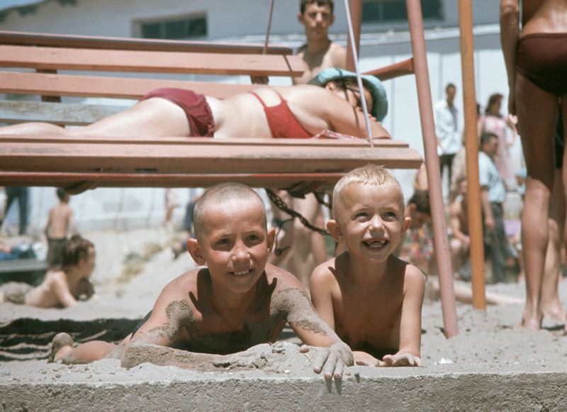 Människor på strand, i förgrunden en bänk med en liggande kvinna under bänken två barn.