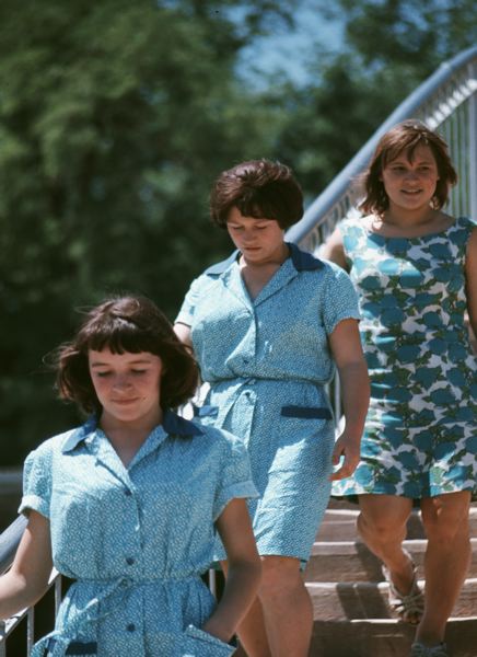 Tre unga kvinnor går nerför en stentrappa.